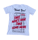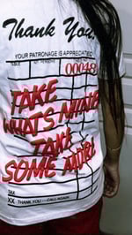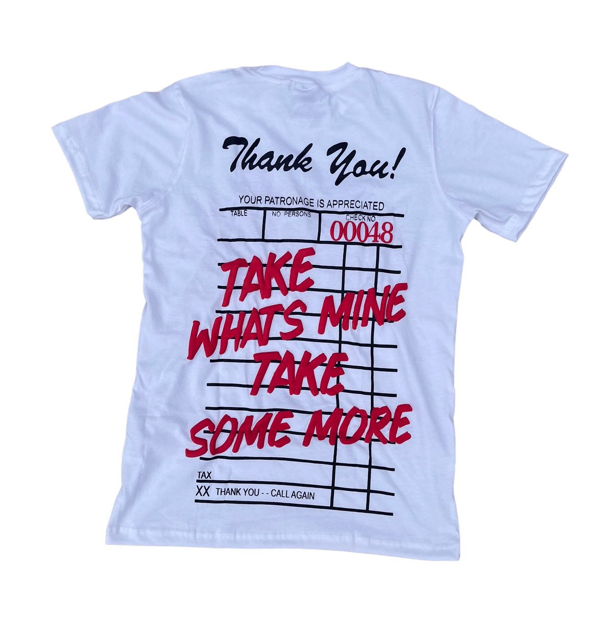 100% cotton white tee with front/back screen printed logos and red high quality puff printed lettering.